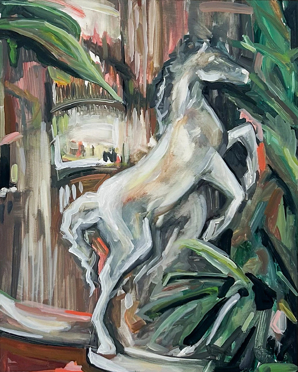 Wheless’ practice centers on the agency, presence, and vitality of the contemporary female body, expressed through energetic, gestural painting. While often known for multi-figure compositions, works like prance (2024) distill that sensibility—capturing movement, rhythm, and a sense of interior freedom through the horse as subject. Her luminous palette and confident brushwork are informed by a lifelong engagement with movement—from early ballet training to plein-air painting along the Northern California coast—as well as a broader interdisciplinary practice spanning film and performance.